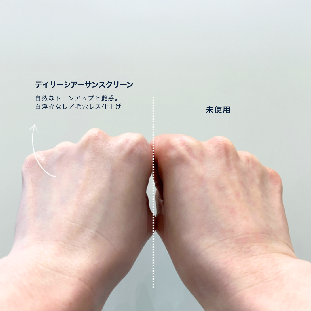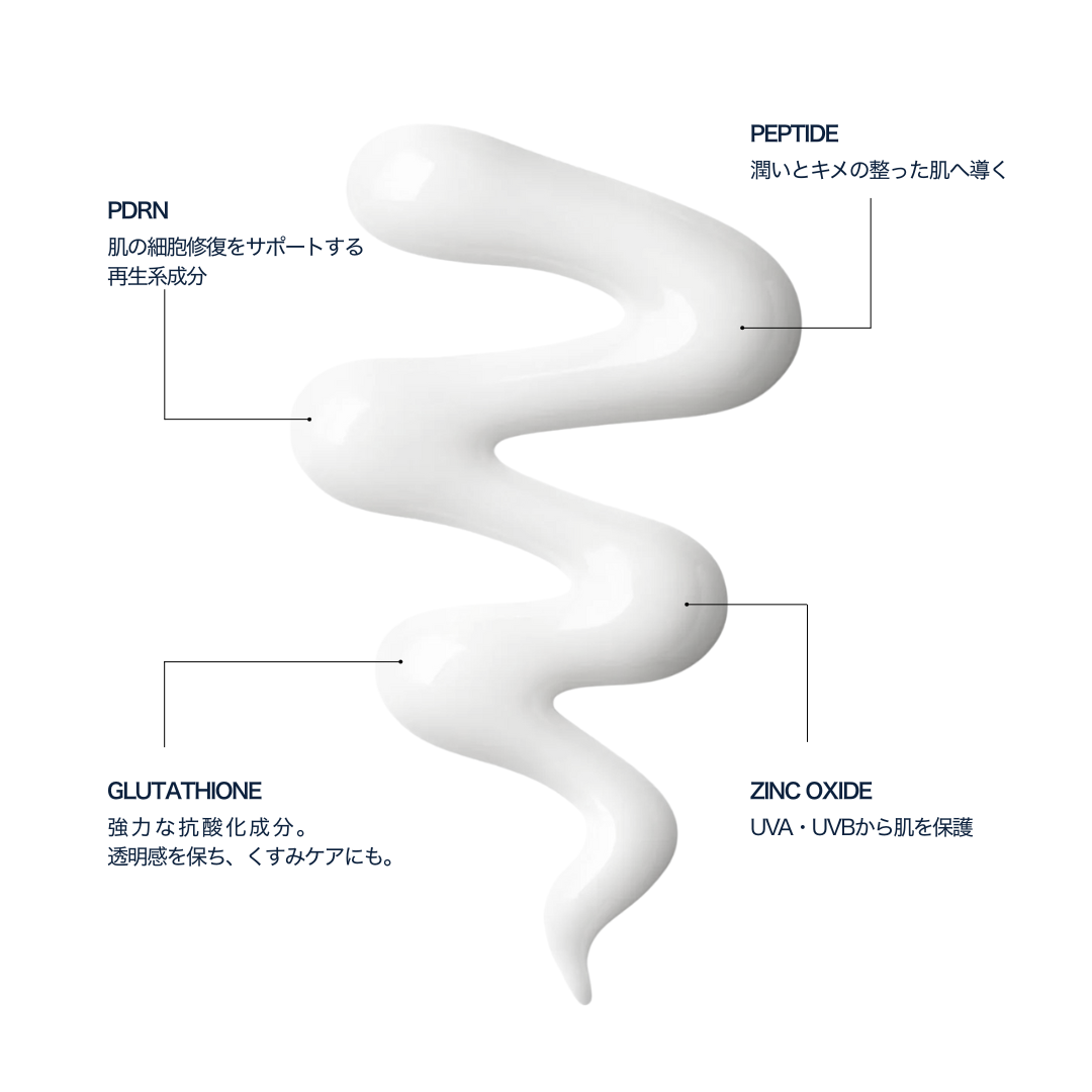PDRN(サーモンDNA)やペプチド、グルタチオンなどの美容成分が日中の肌をケアし、透明感とハリのある素肌へ導きます。SPF50+/PA++++で光老化や乾燥を防ぎながら、白浮きせず自然にカバー。メイク下地にも使える心地よいツヤ肌仕上げです。